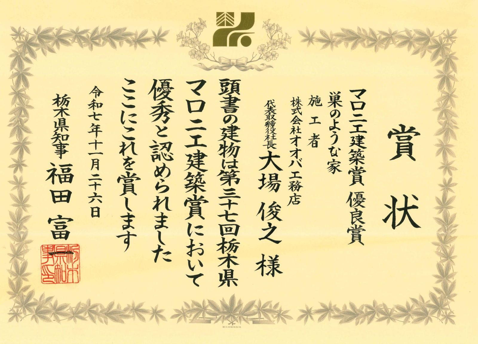 弊社が施工した住宅(巣のような家)が栃木県のマロニエ建築賞の優良賞を受賞しました。